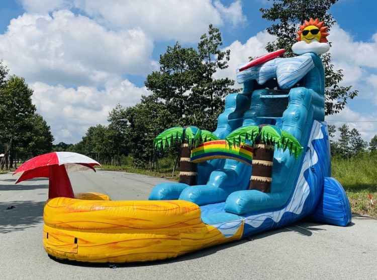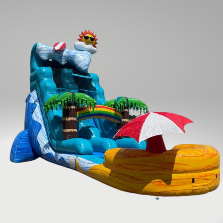The Beach Wave 18ft water slide is not only a blast to play in, its incredible graphics will have the crowd at your party absolutely stunned! With an umbrella in the HUGE deep pool for some lounging, and then some amazing looking palm trees and rainbow at the entrance of the stairs, and then the coolest sun ever chillin on top of the wave with his surfboard! Nothing says summer fun like the Beach Wave water slide. Features: Easy climb stair system for fast safe access to the top, no-jump safety netting keeping kids from jumping down the slide, built in misting system at the top of the slide to keep the kids riding in style and of course the huge deep pool at the bottom of the slide to splash down into!